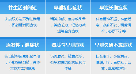 临床早泄分为轻度、中度、重度早泄;又分三大类偶见性、习惯性、老年性早泄,症状如下:
